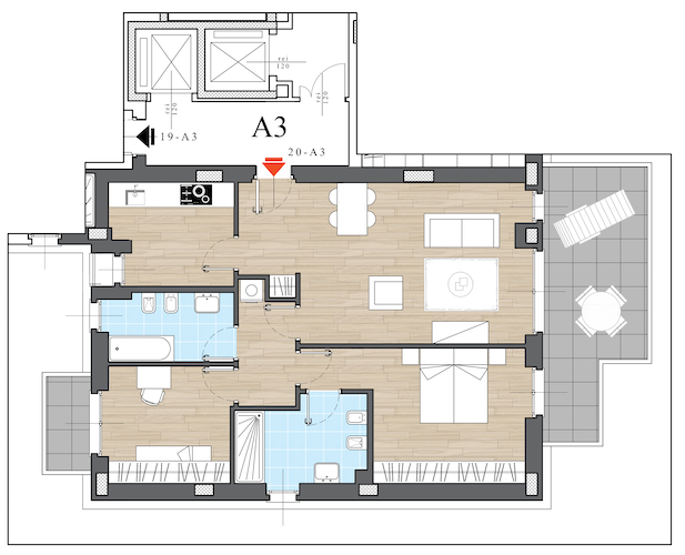 Bilocale con cucina a vista, camera, bagno, disimpegno attrezzabile e ampio terrazzo, balcone e cantina.